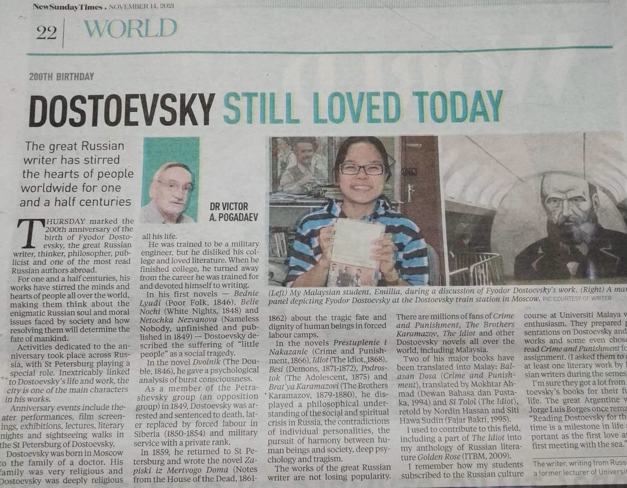 Не прошел он мимо и дня рождения Фёдора Михайловича Достоевского, опубликовав статью в малайзийской газете New Straits Times.