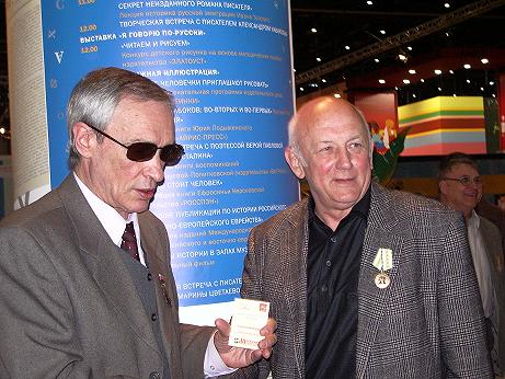 Котюков (слева) вручает Александру Фитцу "-олотую Есенинскую медаль"