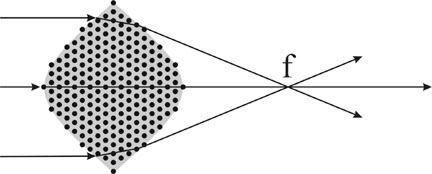 Схематическая картинка действия акустической линзы, круговые точки - сеччения цилиндров. Звуковая скорость не зависит от направления внутри кристалла и поэтому фокус единственнен. Но вследствии неоднородности поверхности линзы наблюдаются очень сильные аберрации ее звуковых свойств.