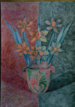 Под сквознячками паутина звеньями кидает тень на голубой и розовый тюльпан.