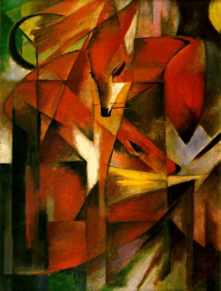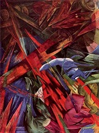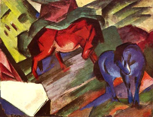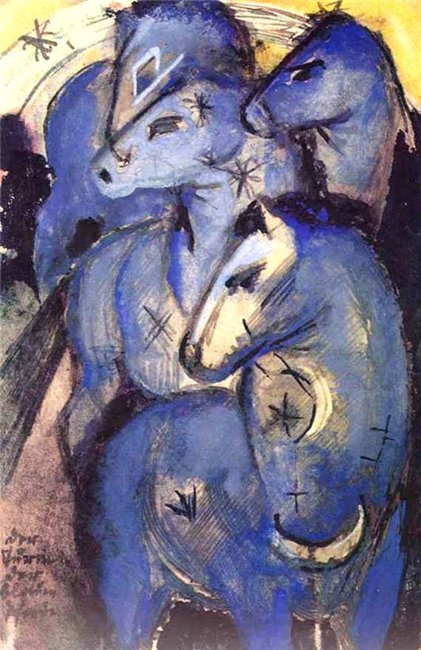Горячий Марк придумал, что синий цвет √ это мужское и аскетическое. И животные √ чистые существа, а человек √ грязное. Поэтому он для животных и природы применяет чистые, не смешанные краски. Отчего-то только на войну пошёл добровольцем. (И погиб.) Апокалипсис, это ⌠не от мира сего■, наверно (чтоб лучше говорить ⌠фэ■), решил постичь душою и телом, а не только духом.