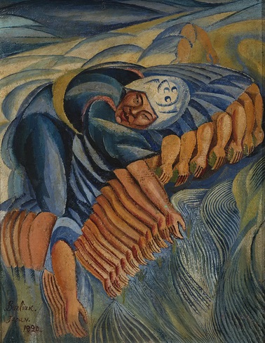 Бурлюк. Японка, сеющая рис. 1920. И это ж святое – стилизовать… Глубже вчувствоваться в себя: что мне шепчет ЧТО-ТО, что сделать… Нет. Веяние времени – всё корёжить. И нечего замысливаться глубже моды. Это в прежнем искусстве было ЧТО-ТО за “текстом”. А что совершенно разные ЧТО-ТО являются в качестве причин корёжения у экспрессионистов, у футуристов и у ницшеанцев, то остаётся вне такого вот поверхностного Бурлюка. Потому он и мог нарисовать вещь в совершенно разном стиле. "Бенедикт Лившиц писал: "Огромные мольберты с натянутыми на подрамники и загрунтованными холстами, словно по щучьему велению, выросли за одну ночь в разных углах мастерской… Меня отзывает в дальний угол Людмила Иосифовна. Она почему-то питает ко мне великое доверие и, со слезами в голосе, допытывается у меня: – Скажите, серьёзно ли всё это? Не перегнули ли в этот раз палку Додичка и Володичка? Ведь то, что они затеяли здесь, переходит всякие границы. Я успокаиваю её. Это совершенно серьёзно. Это абсолютно необходимо. Другого пути в настоящее время нет и быть не может. Хуже обстоит дело с отцом. Он разъярен: мальчики издеваются над ним. Стоило ли воспитывать их, на медные гроши учить живописи, если они занимаются такой мазнёй, да ещё выдают её за последнее откровение. – Я левой ногой напишу лучше! – бросает он в лицо сыновьям и сердито хлопает дверью. Часа через три Давид приносит отцу пахнущий свежей краской холст. Не дать, не взять, Левитан.