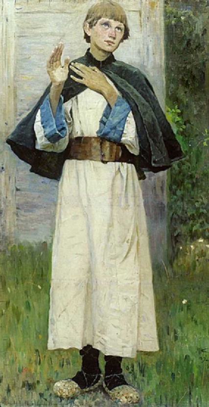 Нестеров. Отрок Варфоломей. 1889. Этюд. Румянец жизни на щеках и руках художнику не понравился. Он остановился на некой мертвенности лица. Правда, рубашка, так и играющая цветом жизни, не перешла в картину. Зато там играют – аж до невероятности – блики на штанах. Более жутка мёртвость живого в другом варианте картины.