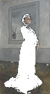 За что живописное хвалят этот портрет? "…уверенность в обращении с пространством холста” (http://valentinserov.ru/glava5/). – Это, наверно, нюанс, обеспечивающий монументальность. Голова видна резко снизу, а шлейф платья – резко сверху. Это то, что подлежит снижению чернотой, для выражения абы какой жизни. "…акцент на силуэте” (Википедия). – Это уже имеет отношение и к непосредственному образу мизерности существования. Ведь силуэт есть малая часть зрительного впечатления. "…абрис силуэта похож на контур возносящейся ввысь струи фонтана – Серов, по своему обыкновению, дал неожиданную, триумфально-патетическую интерпретацию излюбленной стилем модерн "льющейся, текучей .линии", приспособленной выражать образы медлительно-заторможенных, полудремотных состояний” (Шехтель. http://www.rodon.org/art-071019143208). А ну, проверим.