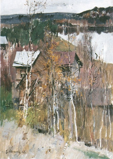Моисеенко. Пейзаж. 1963. Придётся отвлечься, чтоб меня поняли, и, возможно, я не прав… Я где-то когда-то услышал или прочёл, что это дурной тон – класть несмешанные белила на холст. А в процитированном источнике Моисеенко – правда, сказано "о лагерном военном опыте” – назван экспрессионистом. У него же повсюду полно несмешанных белил на холстах. Вот я и делаю вывод, что и тут он экспрессионист, раз белые у него не только берёзки, а и блестящая на солнце жестяная крыша, и кое-где даже трава. Против чего он истошно кричит в 1963 году? Перед нами город, а не деревня. Потому что мне кажется, что окно, которое явно видно как окно, это окно второго этажа. А в деревнях нечернозёмной полосы (а это именно она, судя по чахлой растительности) двухэтажных оштукатуренных домов не было. И это была вторая половина ХХ века, переход от индустриального общества к постиндустриальному. То есть, стыд и позор такой отсталости на периферии. А 2 года тому назад Хрущёв пообещал коммунизм через 20 лет. И все – вокруг меня, во всяком случае – хохотали. А Моисеенко, вот, голосил истошно. 21 сентября 2023 г. Самое дикое, когда этот вопль называют словами позитивными: "…живой, искренний отклик на красоту и обновляющиеся формы реальности… Чарующая легкость, виртуозность письма, удивительная ясность, “кристальность” внутреннего состояния” (https://vk.com/@pmk_fakel-mastera-hudozhestvennogo-iskusstva-moiseenko2). И выдаётся такой пример для наглядности: