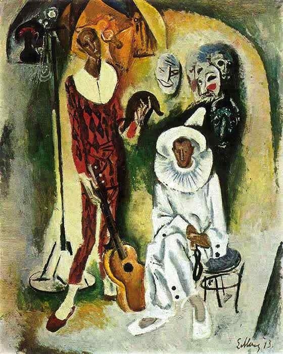 Моисеенко. Пьеро и Арлекин. 1973. А я могу сказать, помня про народность комедии дель арте, что ужасность на данной картине масок да и лиц – это смех над собою сквозь слёзы власти советов, отстранённой коммунистической партией от власти. Вернее, плач Моисеенко, осмыслившего, как надругались над советами в СССР. Или, как выразился гораздо более сдержанный историк Евгений Спицын: "Так сложились исторические условия, что полностью потенциал органов советской власти так и не был раскрыт” (https://dzen.ru/video/watch/64ccaff82e4e3d36d13f8922). 27 сентября 2023 г.