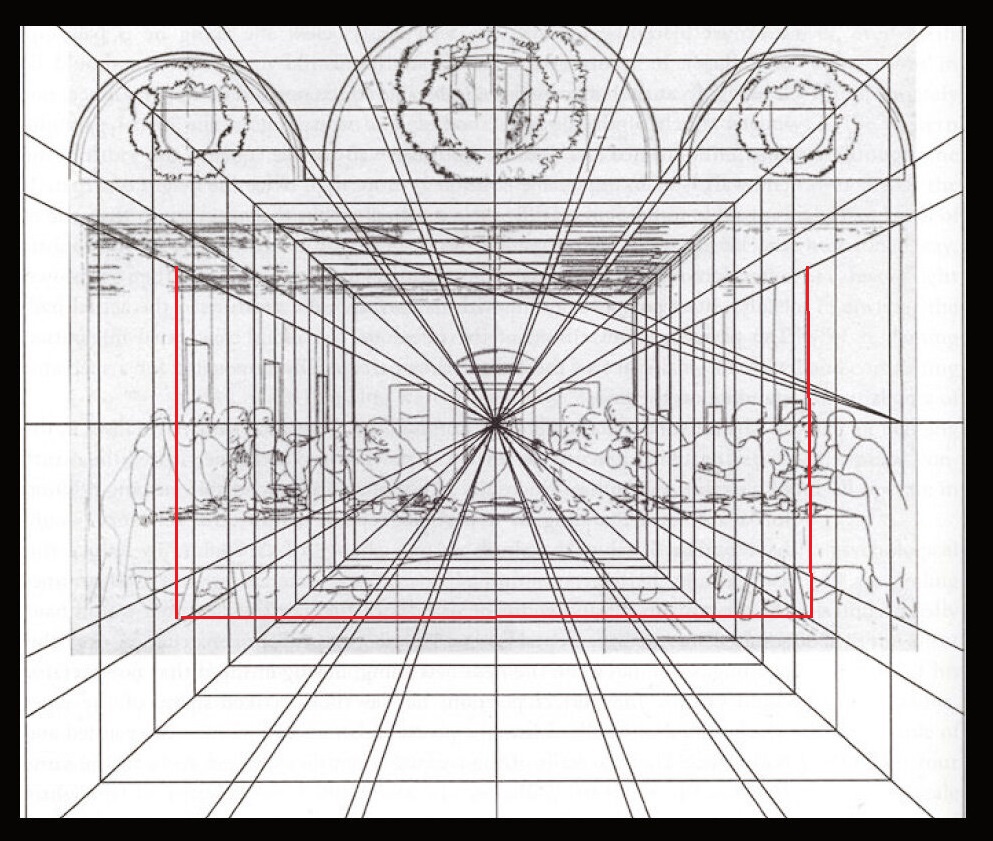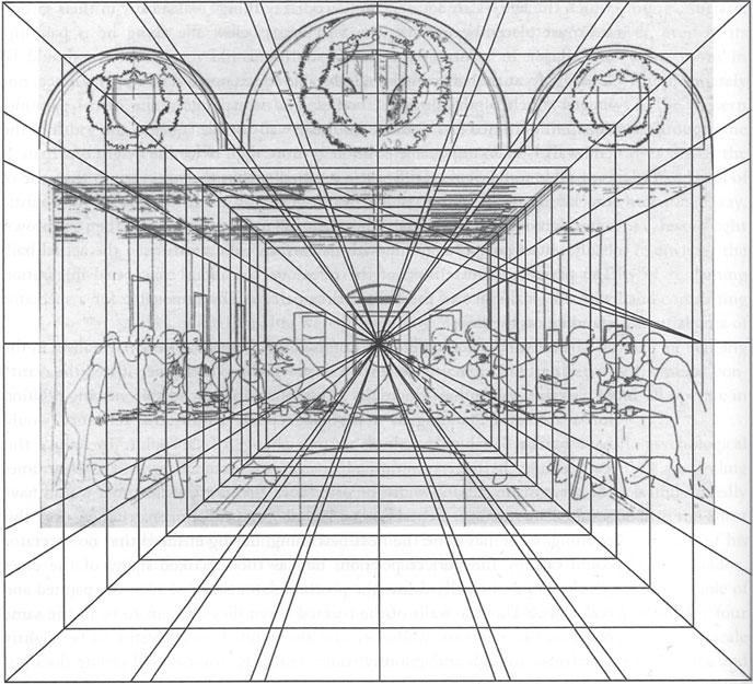Мне так много нужно сказать, а писать по плану я не умею, что вы уж, читатель, мне простите, если сумбурно выйдет. Всё началось с прочтения такой фразы Тарабукина в его работе "Проблемы пространства в живописи”: "В “Тайной вечере” Леонардо нетрудно заметить тесноту помещения по сравнению с фигурами сидящих за столом апостолов. Сосуды на столе также далеки от правильности перспективной трактовки”. Про сосуды мне было ново. А про фигуры – нет. Я про это вычитал у Флоренского, очистил от христианопочитания и написал статью (см. тут). Но она нечитабельная для обычного читателя, я её нигде, кроме своего сайта не опубликовал. Я сам её не понимаю в обычном чтении. Это потому, что, когда я её писал, я сперва делал геометрические построения, но их в текст ввёл не чертежно, а словесно. Чтоб мне теперь словеса эти понимать, нужно проделывать, описываемые построения. Так вот про что-то с сосудами мне было читать впервой, и я целый день потратил на поиск чего-нибудь описывающего, что там не то. Не нашёл. И, чтоб всё же не сдаться, решился на высказывание такой мысли. – Теснота-то для сидящих за столом есть теснота относительно комнаты. Так? Ну вот я и буду понимать Тарабукина, что и то, что НА столе слишком велико относительно комнаты же. Перец в том, что, пока я искал, я наткнулся на репродукцию того наброска на бумаге, с которого началась эта огромная фреска.
