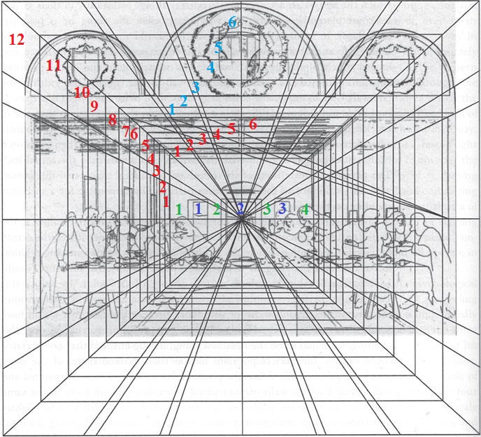 https://falyosa.livejournal.com/5260495.html [Сумма 3+4+6+6+3+6+4 действительно = 32, что написано вверху столбика.] Леонардо наверняка знал из разных источников, что ноты можно записывать числами, поскольку высота звука зависит от нескольких переменных, таких как размер и вес музыкального инструмента или его составных частей. Например, если разрезать струну пополам, высота ее звучания будет на октаву выше, чем у целой струны; октава, соответственно, обозначается через соотношение 1:2. Две трети от полной длины будут давать тональный интервал в пятую долю (выражаемый через соотношение 2:3), а три четверти – в четвертую (3:4). Леонардо использует эти соотношения при расчете пространства комнаты, в которой сидят Христос и апостолы, превращая ноты в своего рода зримую музыку. Архитектурные детали на картине, судя по всему, организованы в виде рядов, привязанных к тоновым интервалам. Как указал один исследователь, соотношение двоек, троек, четверок и шестерок на рисунке Леонардо представляет собой соотношение между четвертой и пятой частью октавы (3:4:6), октавой (3:6) и пятой частью (4:6). В “Тайной вечере” действительно прослеживается арифметическая прогрессия. Например, если стена трапезной разделена на двенадцать частей, то кессонированный [с углублениями] потолок на первом плане – на шесть, что дает соотношение 1:2 (октава). Дальняя стена по ширине дает четыре таких же части, а окна – три таких же (если измерять ширину между центрами двух боковых окон, а не между их внешним краем). Тогда получается (с небольшим приближением) пропорция 12:6:4:3. То же соотношение существует между шпалерами на стене. Они – разной длины, те, которые расположены в дальней части комнаты, увеличиваются в соотношении 1:1/2:1/3:1/4 – давая (на сей раз без всяческого приближения) математическую пропорцию 12:6:4:3” (https://design.wikireading.ru/hqOvwUcaIX). Нарочно непонятно при этом пишут. Хорошо: "стена трапезной разделена на двенадцать частей, то кессонированный [с углублениями] потолок на первом плане – на шесть”. Хорошо, пусть первый план пронумерован синими числами.