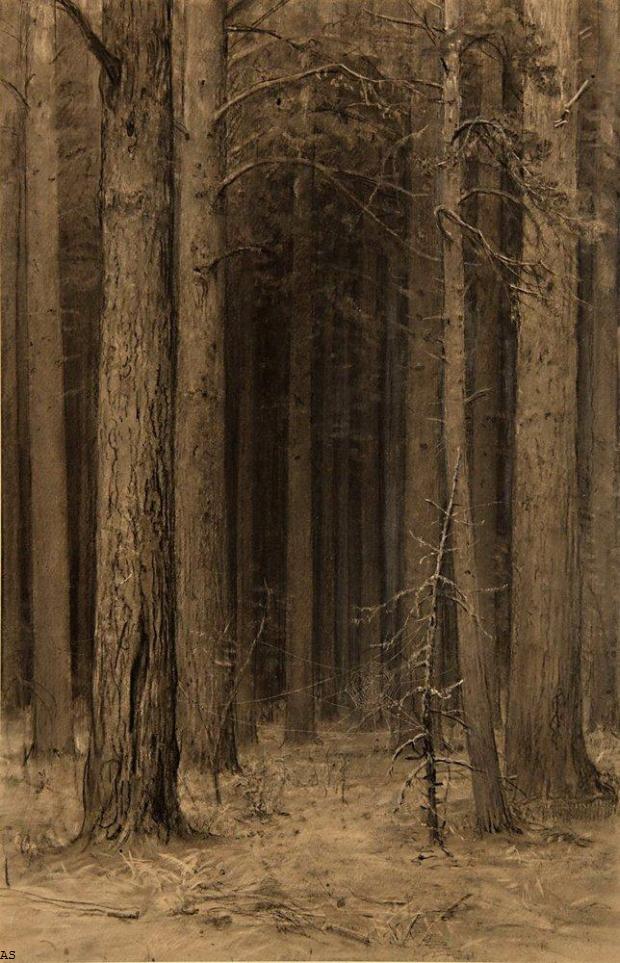 Шишкин. Паутина в лесу. 1880-е. Так, верный духу аналогии Синусоиды идеалов (её плавности) с плавной изменчивостью идеалов и их историческим превращением из типа в тип, должен считать, что тип идеала у Шишкина в 80-е годы не менялся. И – какой был (см. тут) - реализм, такой и остался: открытие (вопреки страдальцам-передвижникам), что происходит расцвет русского народа (что и подтверждалось, - неведомым, впрочем, для Шишкина – он просто чуял расцвет, - демографическим ростом в стране, где 98% населения – крестьяне). Могучесть этого леса в "Паутине…" очевидна. Это и тьма чащи, и непроходимость (из-за такой огромности в пространстве, что аж паутина нетронута – так тут далеко от мест, куда позволяют себе в этот чудо-лес углубиться люди). И различие по мраку-мощи и свету-не-знаю-пока-чему между Шишкиным и Гуркиным шепчет мне, что надо не обращать внимания, что один был учеником другого. Можно взять посветлее шишкинскую вещь.