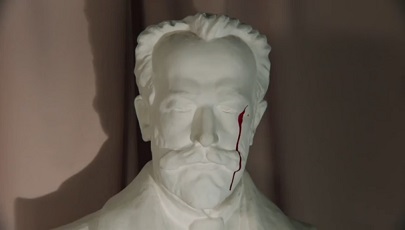 В фильме бюст стоит в 1922 году на одной из площадок лестницы в здании Екатеринбургской филармонии. И вот он оказался повреждённым, как я понимаю, во время попытки кого-то убить в филармонии. А Полина Шнайдер, легендарный деятель гражданской войны (она и агитатор, и лекарь, и командир бронепоезда, и дипломат), выхватила пистолет (партийные тогда ходили вооружёнными, насколько я знаю) и дала отпор. Ну мало ли было контрреволюционных акций в 1922-м? – Уже мало (см. тут). Особенно на Урале. Но ладно, чего придираться? Могло ж быть. Вот режиссёр и ввёл такой случай. Но предметом авангардного искусства этот эпизод становится потому, что пуля, попав в бюст Чайковского, пускает кровь из него, кровь течёт по щеке, усу, подбородку и капает ещё ниже. Настолько страстный-де протест против контрреволюционного бандитизма выражен. Опупеваешь. И я не знаю, есть ли тут авторский негативизм к такому выходу за грань условности. Или, вот, сцена с музыкальным авангардизмом. Музыкальная энциклопедия о нём говорит как о поиске новых выразительных средств, превращающихся в самоцель. Иллюстрацией этого в фильме является что-то электрическое в виде какой-то катушки индуктивности, изменяющей какой-то параметр от меры приближения к катушке руки. Получаются какие то сказочные звуки. Полине представляется, судя по выражению её лица, что вот он, приближающийся коммунизм, рай на земле, эпоха благоденствия. Здорово, казалось бы. Но. Это помещено в такой эпизод. – Гонящаяся за стрелявшим по филармонии с большим пистолетом наперевес, Полина упирается пистолетом в человека, играющего ладонями на упомянутом волшебном музыкальном инструменте; звуки её сразу как бы гипнотизируют; она велит подозреваемому поднять руки и пробует сама “играть”; увлекается, кладёт пистолет на пюпитр; спохватывается и затыкает его за пояс; подозреваемый хватает пистолет оттуда, наставляет на Полину, она поднимает руки вверх и ждёт смерти; выстрел, и изо лба подозреваемого вытекает такая же струйка крови, как давеча из бюста Чайковского. Это, оказывается, сзади этого подозреваемого выстрелил в него какой-то явно знакомый Полине человек, так она очарованно на него смотрит. И тут же они, забыв про труп, вместе играют на звучащей петле индуктивности. И льются чарующие звуки. Опупеваешь. И не понимаешь, как же к этому относится режиссёр. И как самому относиться. А недопонятность – это ж художественность, максималистски выражаясь. Но накладки? Человек, только что спасший Полину, - Иван. Композитор-авангардист. Он отказывается ехать с Полиной к хантам. Говорит, что ему надоело держать в руках маузер, он хочет держать дирижёрскую палочку. – Так маузер ему, во-первых, только что пригодился. Во-вторых, предложение Полине ехать к хантам, приучать их к больнице и другим благам цивилизации, подружить их с советской властью, дано ж ей в 1922 году, а действие в Югре отнесено в 1934 году, судя по той надписи на доске. – Белиберда. – Как всё, относящееся к авангардистам?.. Касательно следующего авангардиста, киношника Петра, вообще ужас какой-то показан. Он-де, согласился при съёмке фильма о мексиканской революции 1910 года, снимать не бутафорскую казнь, а двух дезертиров, подлежащих казни. И вот показывают нам какое-то чёрно-белое кино, где закопанных по грудь людей затаптывают всадники. От полной каши для зрителя со временем 