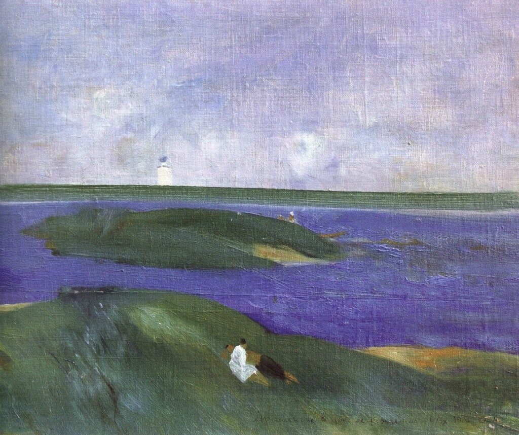 гармонии низкого и высокого {1}, трагического героизма {2}, благого для всех сверхбудущего {3}, соединения несоединимого {4} и ценности абы какой жизни {5} – не подходят). И эта вот картина, за год до начала перестройки написанная, по такому времени создания подходит, казалось бы, под колоссальное разочарование (в так называемом социализме как самом передовом общественном строе, открывавшем начало нового мира… ибо чем сильнее очарование, тем сильнее и разочарование)… Но ницшеанство-то – мрачно. Смерть любит – за уход из этого скучного, скучного, скучного мира… А скука ли тут у Мыльникова? Непереносимая – чтоб аж в иномирие мечтой унестись?... О. Кажется, нашёл! Видом же ницшеанства, активного неприятия Этого мира, является пассивное его неприятие – пробуддизм, идеал минимального чувствования, нирваны. – Пожалуй, пробуддизм подойдёт. Всё как-то истаивает. Женские фигуры теряются на фоне трав. Не понять, где кончается облако и начинается голубизна неба. Где кончается каждая кочка. Что за синие цветы на лугу. Одна или две женщины на нём. Стог ли там (он что-то низенький) или что другое. И, главное, манинская "цветовая гамма обязательно холодна”. Ведь о радости от буддизма можно прочитать только у пиарщиков его, как-то зарабатывающих, наверно, от его рекламирования и самими ими до конца не исповедуемого (я, сталкиваясь с ними, их, наоборот, в чувственности подозревал). Неожиданность данной картины в резком разграничении неба и земли. Только на левом краю горизонта есть едва заметная реалистичная синь дали. – Художник как бы таится. В самом деле: ещё тоталитаризм же в силе и можно пострадать за пробуддизм. – Вот и не тотальное марево тут мусатовское (тот разочаровался из-за ухода с исторической арены дворянства).