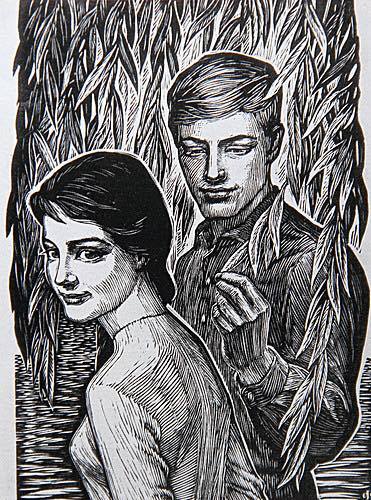 Но кто из зрителей может это знать? – Мало кто. Если удочкой ловил рыбу чуть не каждый, то сетью – меньшинство. Рыбаки, даже делая осмысленные движения челноком, не были б поняты большинством зрителей. Так же, возможно, и в другой картине: там – не исключено – рыбаки складывают сеть, но нам это не понятно. И это нужно, чтоб проакцентировать, что главное не работа. Главное – сообщить "цветовому строю сухость и жесткость”, специфическую красоту, как-то агрессивную по отношению к свирепствовавшему в СССР вещизму. Против эры Потребления, конька современного капитализма. А в подтексте гравюры, где "просто молодые люди рядом”, чувствуются общие и "широкіе общественные интересы”*. Могу засвидетельствовать: именно они очень быстро вмешались в мои переживания, когда я, достаточно грязный тип, влюбился в мою будущую, ныне покойную, жену, участницу движения КСП, левого крыла этого движения. Если считать, что Маркса в России слишком материализовали (может и просто не зная о его идеализме – не всё было переведено), то понятно, почему Засулич не приняла Октябрьскую революцию, акцентировавшую принудительный момент. Не за родной ей (она отказалась от терроризма) идеализм социализма не приняла. А тот, идеализм, долго теплился даже и при лжесоциализме. Что почуяли левые шестидесятники. И вступили в “бой” за него. Против властвующих коммунистов, предателей коммунизма. Поначалу – с оптимизмом. Как Фейгин. А потом – с трагическим героизмом (откуда "сухость и жесткость”). 27 февраля 2019 г. * - Голословно.- Признаю. Элементами “текста” являются невидящие взгляды. У неё – вдаль, у него – на кончик ивового листа. Не друг на друга. Ещё – то, что они рядом, одно направление мыслей у них. Про направление-то, да, можно думать, что оно – в будущее, в их общее будущее. И это уже некий обществизм. С равенством – они одинаково красивые, подходят друг другу по физической стати, возрасту, по культуре (это горожане и даже можно предположить, что из интеллигентных семей). Если ветки ивы отгораживают их ото всех и намекают на интим, то взгляды – наоборот. У ней настолько широко раскрыты глаза, что очевидно, что ей в эту секунду что-то в парне открылось. “Он!” – как бы сказала она себе. А почему сказала? – Потому что он что-то произнёс такое… Обнаружилось родство душ только что. Именно душ, потому что слова только что были. И не “Я люблю тебя!” – Тогда б она на него смотрела. А он – на неё. Это б была больше телесно-духовная сцена. А тут – духовная. Что-то типа: “А после института поедем Сибирь осваивать”. – А это – её мечта!.. Подальше от комфорта европейской части СССР. Где нравы – чище. И – её взгляд летит. Оттого что парень просто настолько же конкретен, насколько он сосредоточен на кончике листка вербы. А в Сибири в то время строились: Красноярская ГЭС (с 1967 ввод агрегатов), Саяно-Шушенская (с 1963-го), Усть-Илимская (с 1963-го)… Это не принципиально другого типа разговор (мне тогда один, разоткровенничавшись, сказал, что мечтает перейти советско-иранскую границу, уехать в США и разбогатеть). Вот не такие были б выражения лиц, если б духовное было б всё в материальном. – Географическая даль и там и там, но не то. Пронзительность, сосредоточенность взгляда была б, а не как тут – вольная волюшка. Что акцент на обществизме в эти годы у Фейгина доказывает и привлечение не мыслимой дали, а видимой.