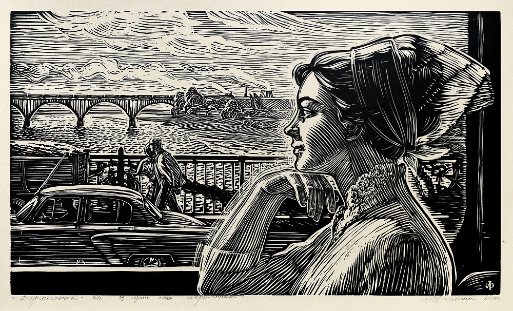 Фейгин. Дарничанка. 1964. Это – вид на Дарницкий мост в Киеве с моста Патона. А мост и название, вместе с датой, намекают на Дарницу, район левобережного Киева, где "После Великой Отечественной войны левобережная часть Киева вокруг застроенной частными домами Старой Дарницы начала интенсивно расширяться. На месте дач и пустырей были застроены известная с 1896 года Новая Дарница и новые жилые массивы — Березняки, Воскресенка, Русановка и другие” (Википедия). – Интенсивнейшее жилищное строительство как-то просветляет будущее девушки на переднем плане, едущей в автобусе в эту самую Дарницу, на стройку. Ибо это не естественное бездумное движение. Естественным у народов, пишущих слева направо, является движение слева направо. А тут наоборот. И автобуса, и легковушки, и двух людей на третьем плане, и кораблика - на четвёртом, и дымов, и облаков на плане заднем. – Это каким-то образом вдохновенное движение. Вдохновение девушки даже изображено – оно летит перед нею, как бурун перед кораблём.