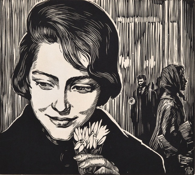 Филатчев. Подснежники. 1964. как-то не сознаёт впечатления частного. (Девушка едет в метро. Оно в Киеве построено в 1960-м.) И не только из-за символа весны – подснежников – образа светлого будущего. Оно естественное, как приход весны в своё время. – Может, из-за – опять! – обратного направления взгляда девушки. И тут – вдохновенного, а не – естественно-безмысленного. А вдохновение ассоциируется с высотой. Это в довольно-таки мещанское послехрущёвское время. Впрочем, любые слова тут неуместны. От этого лица взгляд оторвать нельзя. 1.03.2019.