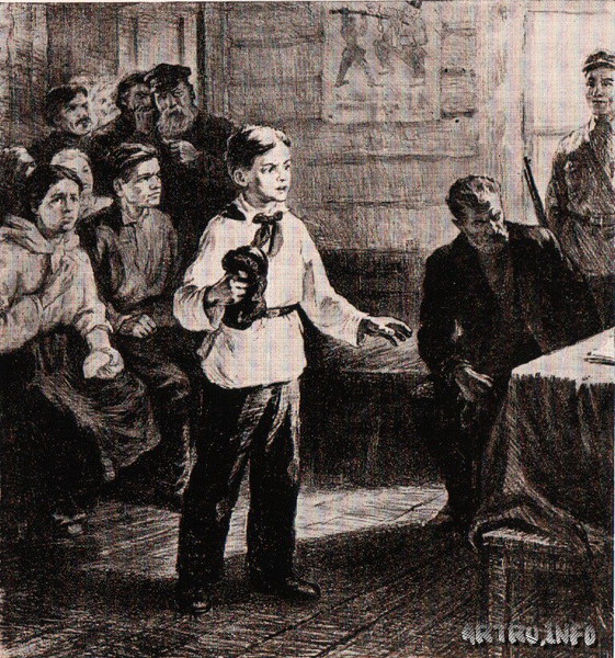 Фейгин. Павлик Морозов. 1962. Потому “наверно”, что надо ж чем-то объяснить, отчего, взглянув на этот рисунок, я полез искать, а что там написали когда-то про подвиг Павлика Морозова. Я нашёл. Текст Губарева - https://www.litmir.me/br/?b=179146&p=1. Вверху там написано: 1963. В первых строчках понятно, что написано в 1962-м: "…вот уже тридцать лет он, как живой, стоит перед моими глазами. В сентябре 1932 года я приехал в глухую таёжную деревню Герасимовку на севере Урала, чтобы принять участие в расследовании убийства…”. То есть к 30-й годовщине написал. Фейгин, видно, тоже к 30-летию рисовал. Позже, читая разоблачение подвига (а подвиг состоял в передаче подложной бумаги от отца Павлика, председателя сельсовета, а именно – бланка удостоверения о якобы принадлежности уезжающего отсюда бедняка, тогда как на самом деле, по словам Павлика, уезжал сосланный сюда кулак), я узнал, что слова: "является жителем села Герасимовки”, - Губарев сам сочинил для первой редакции книги и переделал, как процитировано, через 15 лет. То есть в 1948 году. И Фейгин рисовал свою картинку по изданию явно 1948 года. И наверно же моя симпатия к Фейгину, певцу социалистического идеала (не лжесоциалистического, бытовавшего в 1962 году), - симпатия к явному левому шестидесятнику (то есть борцу за спасение социализма от лжесоциализма), заставила меня уцепиться за тот факт, что Фейгин книгу Губарева извратил. И та же пристрастность, не даёт мне думать, что Фейгин перед рисованием пользовался обвинительным заключением следствия или приговором суда. – В первом написано: "Морозов Павел, являясь пионером на протяжении текущего года, вел преданную, активную борьбу с классовым врагом, кулачеством и их подкулачниками, выступал на общественных собраниях, разоблачал кулацкие проделки и об этом неоднократно заявлял...”. Во втором – чуть иначе: "активное выступление пионера Морозова за выполнение проводимых кампаний... вызвало к Павлу дикую злобу со стороны родни...” (http://online-knigi.com/page/60222?page=3). Написано то и другое в книге Дружникова “Доносчик 001, или Вознесение Павлика Морозова” 1987 года (написанной в 1984-м). И там есть слова: "Нам удалось получить "Следственное дело в"-374 об убийстве братьев Морозовых, подготовленное Секретно-политическим отделом ОГПУ по Уралу"”. – Это было, понимай, после рассекречивания. Чего не было в 1962 году. И Фейгин не мог читать того, что читал Дружников. То есть Фейгин пользовался книгой Губарева. А в ней нет того, чтоб Павлик "выступал на общественных собраниях”, что, тем не менее, Фейгин нарисовал. Что есть у Губарева? Что присвоенные отцом, раз тот председатель совета, конфеты Павлик не стал есть. Что отхлестал отец его за то, что вступил в пионеры. Даже увильнул Павлик от ответа на вопрос подружки Моти (а никого около нет): "— Ты слышал, Паш? Что это твой отец Кулуканова [кулака] середняком считает?” Никаких выступлений на собраниях у Губарева. А сразу после доноса Дымову (присланному из района партийцу смотреть за хлебосдачей государству) на отца: "— Эти… бумажки… отец продаёт врагам… Сосланным кулакам с Кубани…”, - идёт что? – "Идя по улице, он чувствовал, что его провожают взглядами, перешёптываются. С тех пор, как суд приговорил Трофима Морозова к десяти годам тюрьмы, Павел никогда не может пройти незамеченным. Правда, не ругают его в деревне за то, что раскрыл преступление своего отца, даже нача