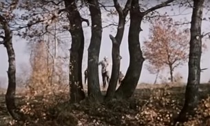 От страха мозги у всех отшибло (все ж – мещане, то есть не герои, делают не то, что надо: взять у пса динамит и выдернуть из него запал). Бегут от пса, хоть это идиотизм – собака бегает быстрее человека. Бегут по прямой. Впереди четыре близко друг к другу растущих дерева. Огибать? Нет. Это дольше. Бегут в промежутки между ними. Первым бежит Трус. Он тонкий. Он проскакивает в центральный промежуток. Балбес, хоть и балбес, видит, что он, более крупный, там не проскочит. Быстро ориентируется и проскакивает в левый (от нас) промежуток. У Бывалого, хоть он и бывалый, мозги отшибло больше всех (он подбил всех на идиотский бег). Он толкается в левый, не пролазит, в центральный, тем более не пролазит, в правый, наконец, пролазит. Это фильм 1961 года. Время хрущёвской оттепели снят. Оттепели, повернувшей путь страны от героизма самоотверженных (каким Гайдай сам был на войне) к комфорту для самых предприимчивых. Путь, подведший экономическую базу под предсказанное леваком Троцким перерождение в капитализм. Что это за база? – Хапать, что плохо лежит. А лежит – плохо.